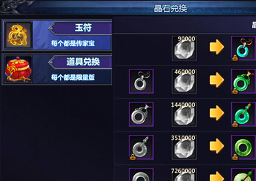 玉符:注意角色有一个装备栏是用来装备玉符的,而玉符是通过晶石进行兑换升级的,获得更高阶的玉符就要使用海量的晶石进行兑换升级!