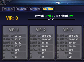 VIP增益:土豪特权,VIP等级越高,带来的特权BUFF属性提升就越多!平民玩家可以忽略!