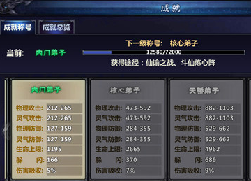 成就称号:从仙谕之战、斗仙炼心阵可以获得成就点数,达到一定的成就点数后可以提升称号!称号越高,属性越强!