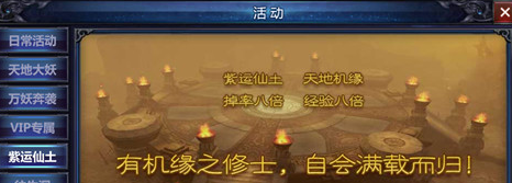 建议在每天玩家战斗达到最高的时候再来挑战,在紫云仙土这张地图里刷怪,每天开放30分钟,可以选择挂机,八倍掉率获得大量的高阶装备、晶火、注灵符、封妖八禁令合成素材、上古鲲鹏令合成素材。