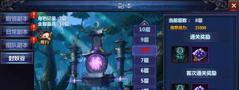 推塔类型的副本,也是玩家战力的检测副本,战力越高就能打过更高的层数,获得更多的奖励!每天可以进行一次扫荡获得之前层数的奖励!主要获得脉诀和灵羽丸奖励!