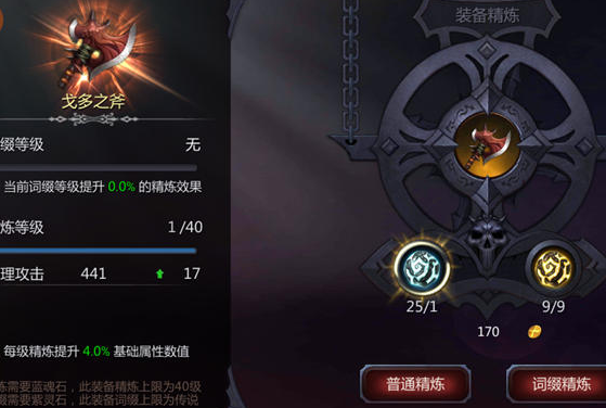 普通精炼需要蓝魂石才能进行,词缀精炼需要紫灵石。根据装备的品质,可精炼的上限也有差别。以下图戈多之斧为例,精炼上限为40级,词缀上限为传说。