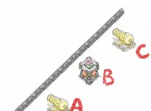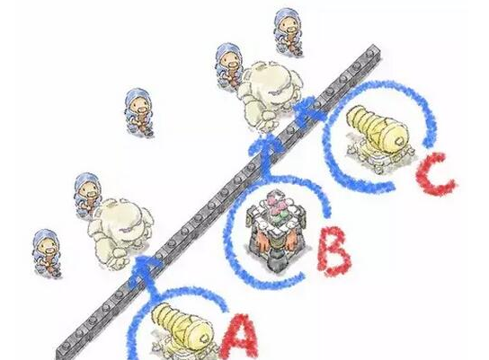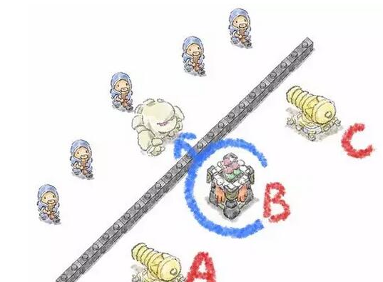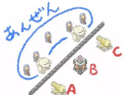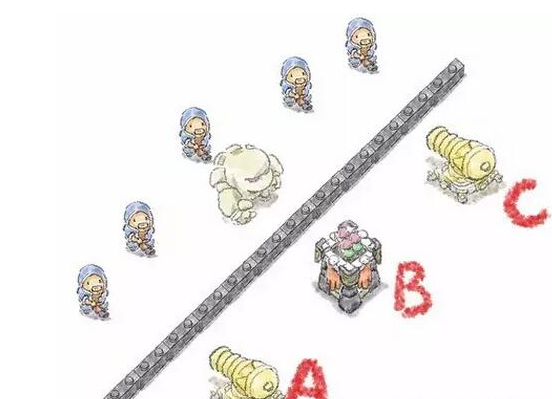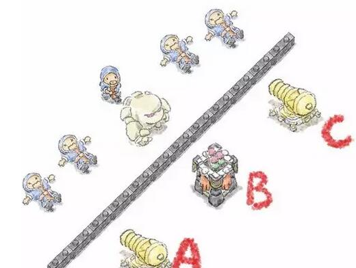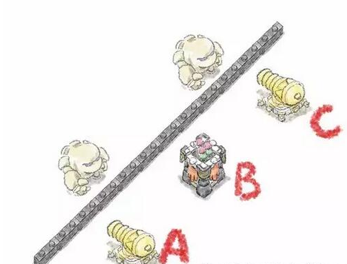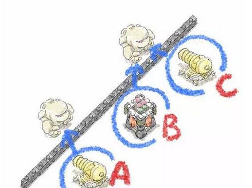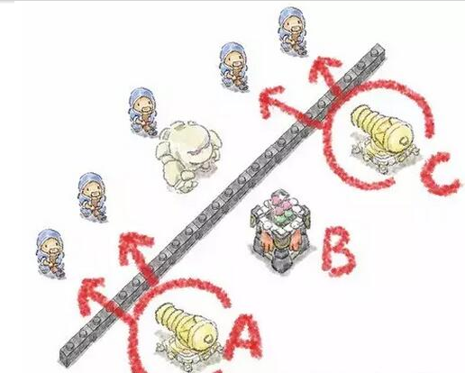 而A和C会因为攻击距离太短,够不到正中央的石头人,就会去炮轰两侧的法师;