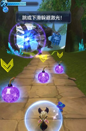 2、躲避激光:在角色接触到紫色炸弹的一瞬间上跳或者下滑就可以躲避激光,很多玩家掌握不住时机被激光打中,会掉很多能量的。