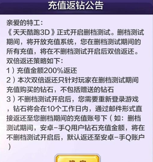 然后有玩家说冲了差不多七八百,结果没有一次赠送过钻石,只有充值的钻石没有充值赠送的钻石,西西在网上为大家整理了答案:公测之后的十个工作日会返还哦,还请各位玩家耐心等待,希望各位玩家在天天酷跑3D中玩的愉快!
