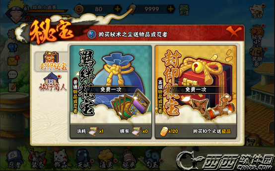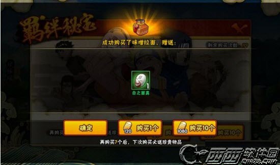 羁绊秘宝:羁绊秘宝消耗钻石购买,钻石可以通过主线奖励,通关修罗难度副本获得,也可充值获得,能够获得更加珍稀的忍者碎片或道具。如果是免费的话是24小时一次。如果直接购买羁绊秘宝必送珍贵物品哦。但是价格还是有点点高,土豪们可以去试试啦!