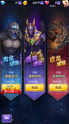 因为玩家能量不能符合剧情模式最低要求的缘故,剧情模式这时候基本上都已经卡着了。所以之前剧情为主,跟着主线走的套路显得不是很合适了,我们应该转为收集资源为主,升级角色、宝物、宠物为辅才是目前的出路。为什么这么说呢?因为这时候玩家飞快提升角色等的等级已经不可能了,就要开始为下一步准备,等到宝物等进阶的时候直接可以消耗材料进阶,这样可以占据优势。