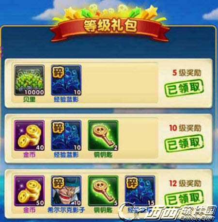 每达到一定等级,就可以去领取等级礼包,里面不但有不少的贝里还有很多珍贵的道具和卡牌碎片等。