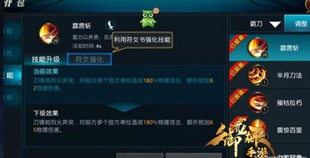 狂霸的技能,半月刀法,强力群攻技能,后期尽量加满,霹雳斩,CD冷却时间短,推荐加满。