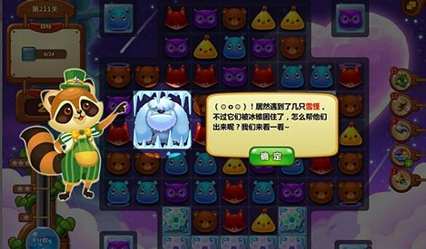 雪怪出现在关卡指定的位置,占据的空间也是比较大的,每一个雪怪会占据4个格子的位置。只有把雪怪周边的四个格子上的冰柱,全部消除之后,雪怪才可以被释放出现。在雪怪被释放出来之后,他会帮助我们随机的消除关卡中的障碍。薄冰,雪块,都可以帮助我们消除。