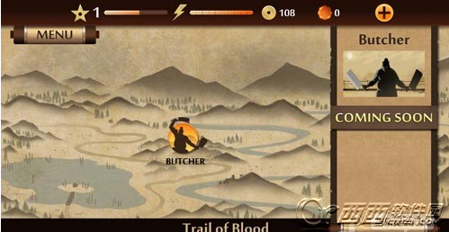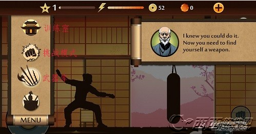 2、MENU菜单:点击左上角的MENU,可以展开面板,第一个图标是进入训练室,在里面可以进行招式的演练;第二个是挑战模式,进入之后可以选择相应的“关卡”来和各个忍者进行战斗;第三个是武器库,可以用金币或者钻石来购买武器、护甲和头盔;最后一个图标的功能还没有上线~