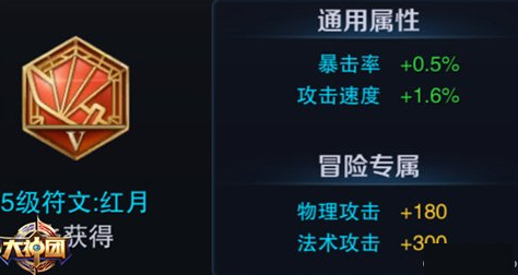 五级红色带攻速属性的符文有:宿命(攻击速度+1%;最大生命+33.7;物理防御+2.3),红月(攻击速度+1.6%;暴击率+0.5%),显然宿命不适合鲁班七号,红月呢,看似不错,但我总感觉暴击率有点偏低,所以我的想法是想通过和祸源(暴击率+1.6%)混合搭配,红月、祸源各五个,这样暴击率能达到10.5%,我觉得这样会更好点。