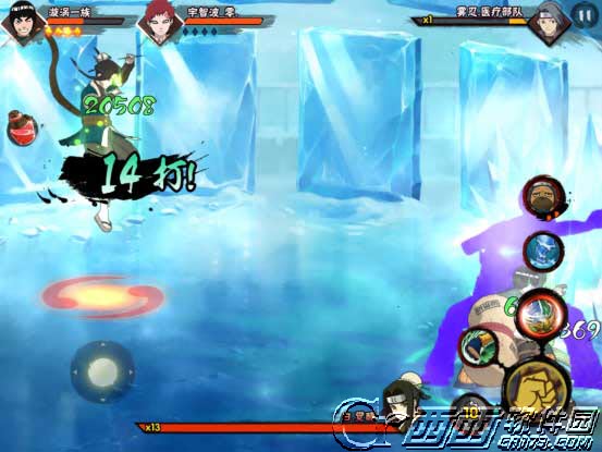 在冰柱爆炸之后,白便会出现在场景中,这时我们便可以抓住机会,打出一套攻击。不过,在被打倒地之后,白会获得一个暂时的无敌效果,然后释放冰遁·冰柱燕。马上向反方向飞跃,并向倒地处发射一系列冰柱攻击。这里建议在白倒地后,不要进行补刀追击,以免被打飞。