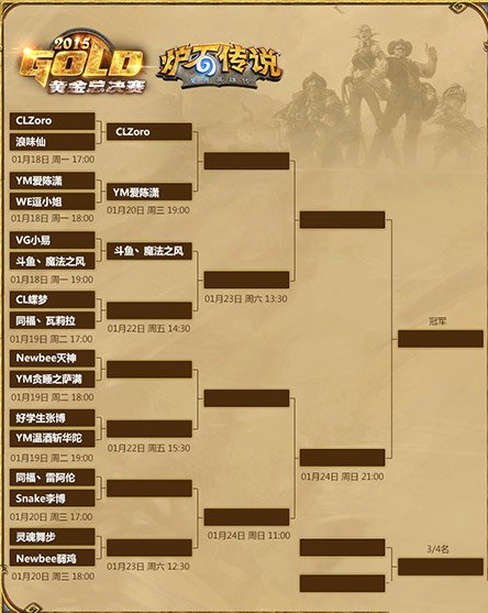 北京时间2016年1月18日17时黄金总决赛《炉石传说》16进8淘汰赛揭开战幕,在这3场比赛中,CLzoro、YM爱陈潇、斗鱼丶魔法之风分别击败各自对手闯入8强,而浪味仙、WE逗小姐和VG小易则遗憾地止步16强。