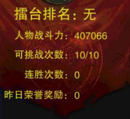 在擂台挑战的左上角玩家们可以观察到自己人物的战斗力,今天可以挑战的次数,连胜的次数,以及昨日排名为玩家们带来的荣誉值奖励。一目了然,十分的方便。