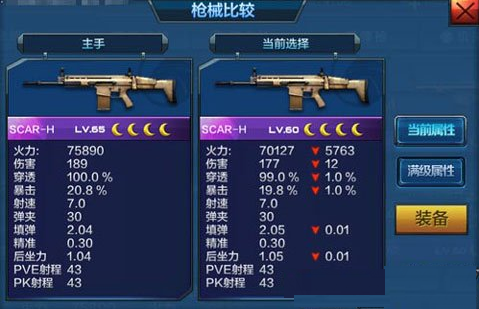 枪械等级上限提升至65后,对SCAR-H的提升还是非常大的,图中大家可以发现65级的SCAR-H比60的足足高了5763点战斗力,并且伤害、穿透、暴击这些属性都有了明显的提升。