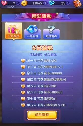 每个新用户玩家只要连续登陆游戏就有八日大礼相送。钻石、宠物、金币送个不停,更有价值千钻的游戏角色免费相送!在接下来的每天登陆游戏签到就能获得金币、钻石、宠物等物品。