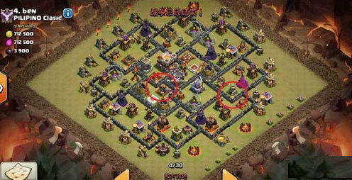 1, 地震如若放在迫击炮上方A位置,可以开到4个区域,同时5号墙也被拆除,这是我第一个思路,然并卵,女王在拆除完周围防御建筑,毅然踏上往12点的方向,面对地狱塔的秒杀,
