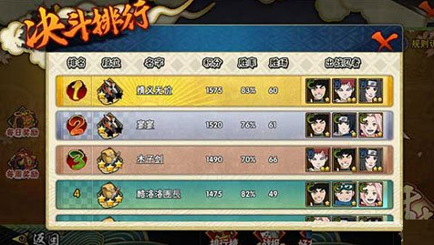 在决斗场的排行榜页面里面可以查看当前服务器,积分和段位最高的前100名玩家,可以看见胜率胜场和出战的忍者。在这里可以通过这些高手们的出战忍者来了解到哪些忍者比较受欢迎,比较厉害,可以根据自己的需要来学习下高手们的选择。一套好的出战忍者阵型,对于我们提升段位是有很大帮助的。