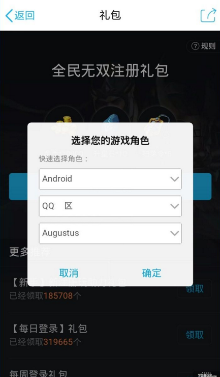 然后选择自己的手机平台、区服已经角色名,并点击确定。