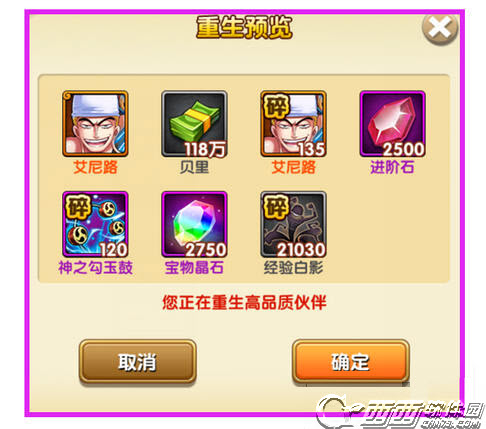 接下来看下伙伴重生可以返还的材料有哪些?同样是以+5的艾尼路为例,主要可以回收到同样的118万贝里、2500个进阶石,不过差别就在于没有海魂的奖励。