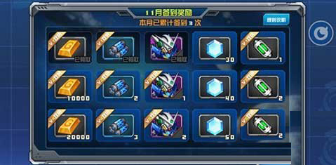 签到在页面正中间,每天0:00刷新,每天可签到一次,可以获得战斗数据、金币、钻石、机体碎片、培养剂等游戏必备道具,千万不要忘了每日签到哦。