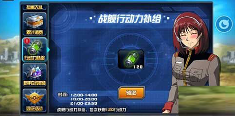 目前位于活动中,每日12:00-14:00;18:00-20:00;21:00-23:59,每次获得120行动力,免费获得,还有萌妹子脸带腮红看着你,就算不是这个时间,看着她也是一种享受。