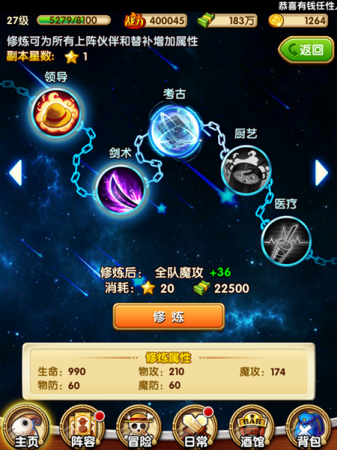 修炼玩法可以为所有上阵伙伴和替补增加属性,玩家可以从考古、厨艺、剑术、航海、狙击、领导、音乐、修理、医疗等方面来进行修炼,修炼后可以获得生命、物攻、魔攻等方面的提升,从而提升队伍的战斗力!