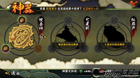 玩家达到一定的等级条件,会开启神器系统,玩家可以自动自动获得一个幌金绳,使用忍玉或者金币能够对神器进行强化,当强化到一定等级后会陆续解锁下一个神器。
