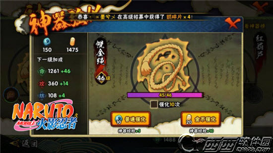 升级神器需要耗费忍玉,每次升级需要10个忍玉,神器升级5经验,若忍玉不够可通过金币强化,每次耗费10金币,但是小编不建议用金币升级,土豪随意。