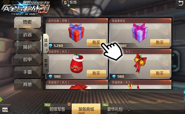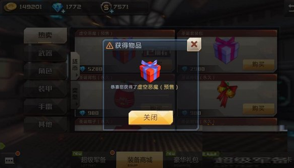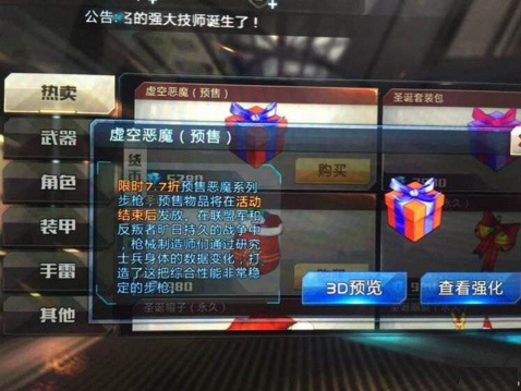进入装备商城之后,我们可以看到第一个商品就是我们的主角虚空恶魔预售礼包!点选礼包,就可拥有全新的恶魔系枪支礼包了!