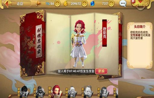 接下来将会进入头目界面,每天玩家进入的卷宗都不一样。遇到的头目也是随机的。在界面的最右面是BOSS的弱点。欧阳克的界面就是女性英雄可对其造成大量伤害。也就是玩家手里有女英雄的话,可以在他的战斗中选用,会有翻倍伤害的效果。