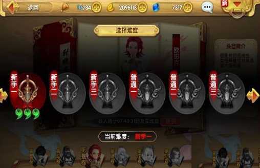 接着就是选择难度的界面。这里的难度选择并不是以战力为进入条件。而是以人物等级为前提。比如新手二的解锁等级是29级,三为33级,四为40级。之后每往后都会有难度的递升。界面中显示的最终关为宗师二,解锁等级为96级。当然这应该是纯后期的玩法了。现在的等级上限都没那么高。