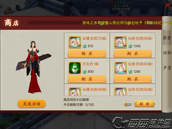 4.蜀山斗剑,一天有15次机会,一定要打完,不论输赢都会有荣誉奖励,荣誉可以在荣誉商店兑换橙色卷轴和药品还有技能书。在活动页面里的“竞技”可以进入,荣誉商店在斗剑报名页面可以直接进入。