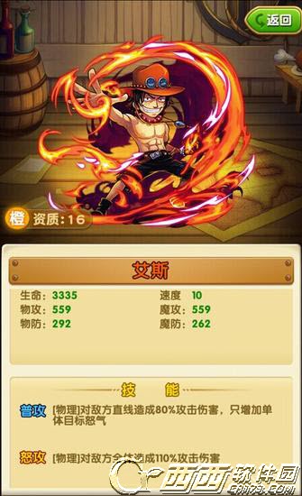 恶魔果实:烧烧果实(免疫灼烧状态,怒气攻击时有60%概率使目标灼烧2回合,若目标处于灼烧状态,任何攻击降低其1点怒气。)
