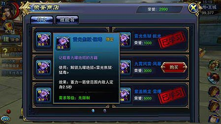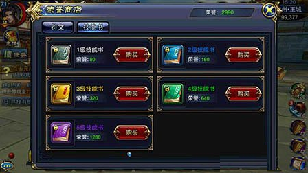 我们在擂台赛获得的荣誉值,可以兑换符文和技能书两种。技能书需要的荣誉值相对比较少,而符文则需要的比较多。符文可以加强技能的效果属性;技能书可以让我们学习更高级别的技能。不同的符文和技能书有不同的价格,等级越高的道具,需要的荣誉值也越多。