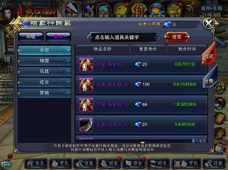 首先介绍拍卖行的购买,拍卖行可以进行购买神器,马具,成长类物品,例如封魔贴,押镖令等。还可以进行购买地术残叶。