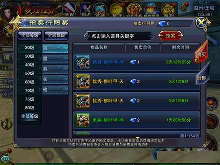 玩家可以选择自己所需要的购买物品等级,例如玩家想买40级的物品是可以进行选择的。我们都知道物品的等级是白,蓝,黄,绿,紫逐渐递增的,所以玩家还可以选择自己所需要的品质来进行购买。在购买是玩家需要注意的是,购买的钻石只可以用非绑定钻石,成功出售商品后获得绑定钻石,这一点还是比较坑爹的。