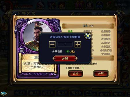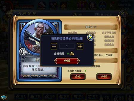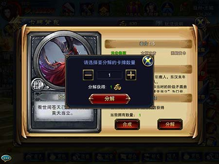 说完虎符的作用就到获取途径了,虎符的获取方法还是挺多的。名将试炼不仅可以获得卡牌,虎符也是可以获得的。八阵图杀怪也是可以获取,这些总结起来就是大战获取虎符。小编在这里说说比较好的方法,就是卡牌的分解。在卡牌背包里面会显示出玩家的卡牌,玩家如果有不需要的卡牌可以进行分解得到虎符,白色卡牌分解得到1点虎符,蓝色卡牌分解得到5点虎符,紫色卡牌分解得到120点虎符。对于紫色卡牌玩家估计舍不得分解,品质太高,其实玩家完全根据自己的需要程度进行分解,所谓合理利用资源就是如此。