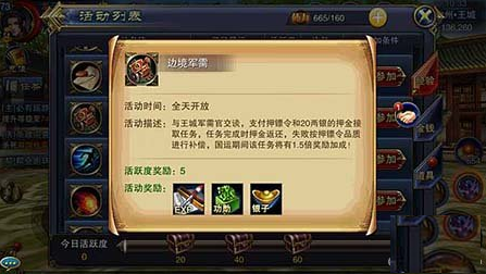 边境军需活动时间为全天开放,我们每天可以做2次,完成任务可以获得大量经验和银子,同时还可以获得功勋奖励和活跃度5点。接取该任务需要押镖令,押镖令分为紫、绿、黄、蓝、白五种,紫色获得奖励最高,依次下降。