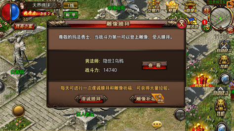 雕像位于比奇城靠上方的位置,在25级之后就可以进行雕像膜拜任务!各个职业膜拜的雕像都不一样,如果你的战斗力达到了该职业的第一,就会成为别人膜拜的对象!