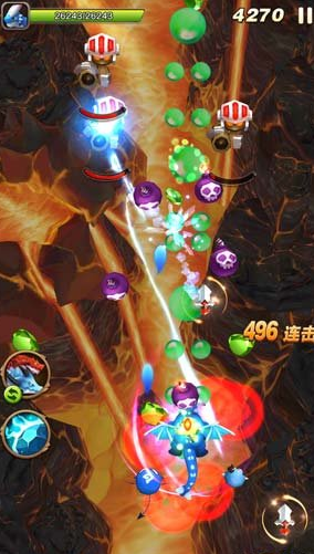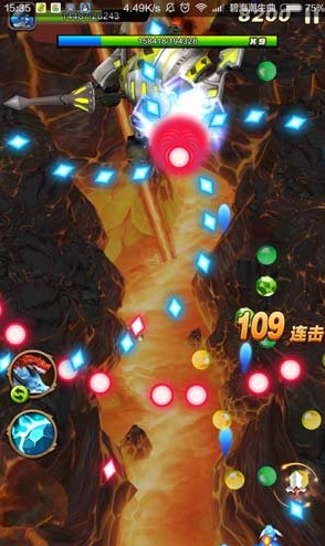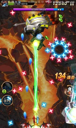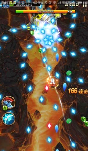 第三种就是BOSS会发射一个物体顺着我们的位置转一圈,然后在我们的下面发射十字型的红蓝色子弹,这个攻击还是蛮高的,我们需要在它到达下面的时候,往上面移动一些距离,然后慢慢在移动下来。在这里是很容易被攻击到的,我们可以选择发射大招来避开这个攻击。后面如果没消灭的话,这三种类型的攻击会继续重复的。