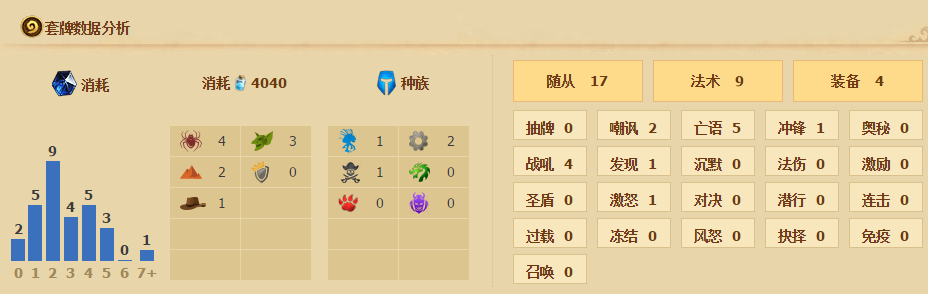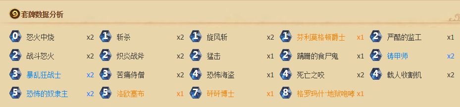 留牌:不知道对面毒瘤德的情况,我手牌一律按咆哮德留,知道的话,胜率高1成,知道形态,起手留武器、猛击和2,3费生物,曲线好可以留收割机和旋风,5费以上生物和激怒过牌一个不留。
