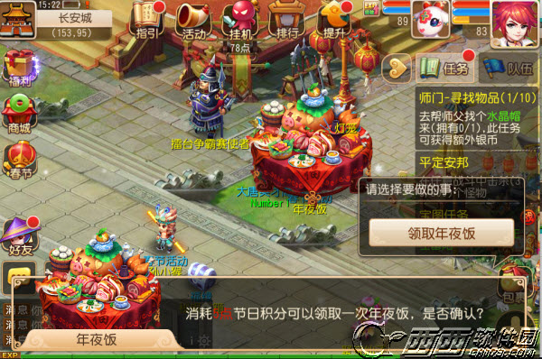 春节期间,唐王令最好的御厨准备了新春年夜饭,少侠可以前往长安城领取美食,不过可能要消耗一点节日积分哟!