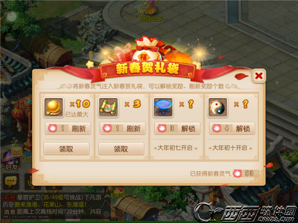 新春贺礼袋是天庭为三界少侠所准备的新年礼物,大于等于50级的玩家,在2月3日维护后,首次登录时可以获得。但新春贺礼袋需要使用新春灵气开启。每个新春贺礼袋中放置了4份礼物,使用新春灵气可以解锁这些礼物。解锁后礼物个数可能不是最大值,继续使用新春灵气,可以刷新礼物个数,刷新到最大值后,就不需要继续刷新了。此外,礼物还需达到开启时间后才可领取。