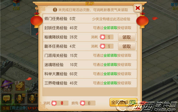 一个日常活动没做,需要消耗3点新春灵气来领取,而新春灵气是可以通过做春节活动获得。