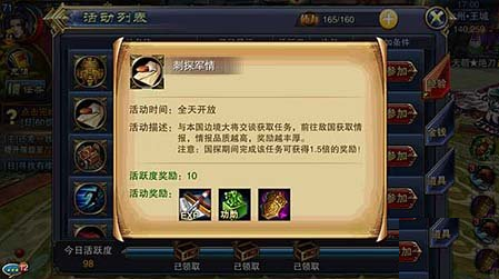 中午的12-14点是国探时间,在这个时间段,我们提交刺探军情、无间道将可获得1.5倍任务奖励,经验可观。因此,个人建议大家在早上完成的军情与无间道任务,留在这个时间点再提交,能实现收益最大化。