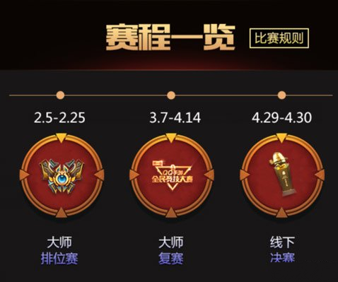 2月5日-2月25日期间进行海选赛,该环节不设报名门槛,玩家有两种方式参与赛事:一是通过QQ手游赛事频道的报名页面进行报名(共有6个出线战队名额),二是直接在游戏内参与排位赛,截至到2月18日0点获得每个区排位榜第一名的玩家也将获得组队权(该部分队伍将PK争夺出4个出线战队名额);复赛将会在3月7日-4月14日进行,除了海选阶段中优胜队伍外。