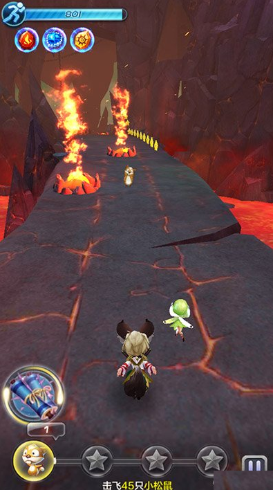 这一关刚进入的时候前面的一点路程还是比较简单的,玩家们只要碰到松鼠就赶紧靠前撞飞他们即可。碰见这种火焰的时候,一定要左右绕开哦,千万不可上跳。