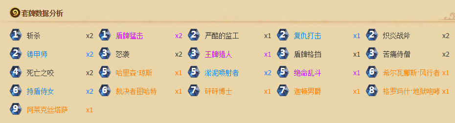 我来说下对卡组构成的看法,两张怒袭和哈里森,双淤泥的携带是为了针对快攻萨和毒瘤德,而嘉顿的携带则是为了打佛祖骑和动物园,我没有携带逐星,伊瑟拉,拉法姆这些过于厚重的东西,针对了环境去提了速,做好苟住就赢得思想,我没有携带双乱斗是因为面对萨满,德鲁伊这些主流卡组这张卡实在卡手卡的有些致命。注意你的攻击次序,先攻击再叠加,护甲的价值比血量高。